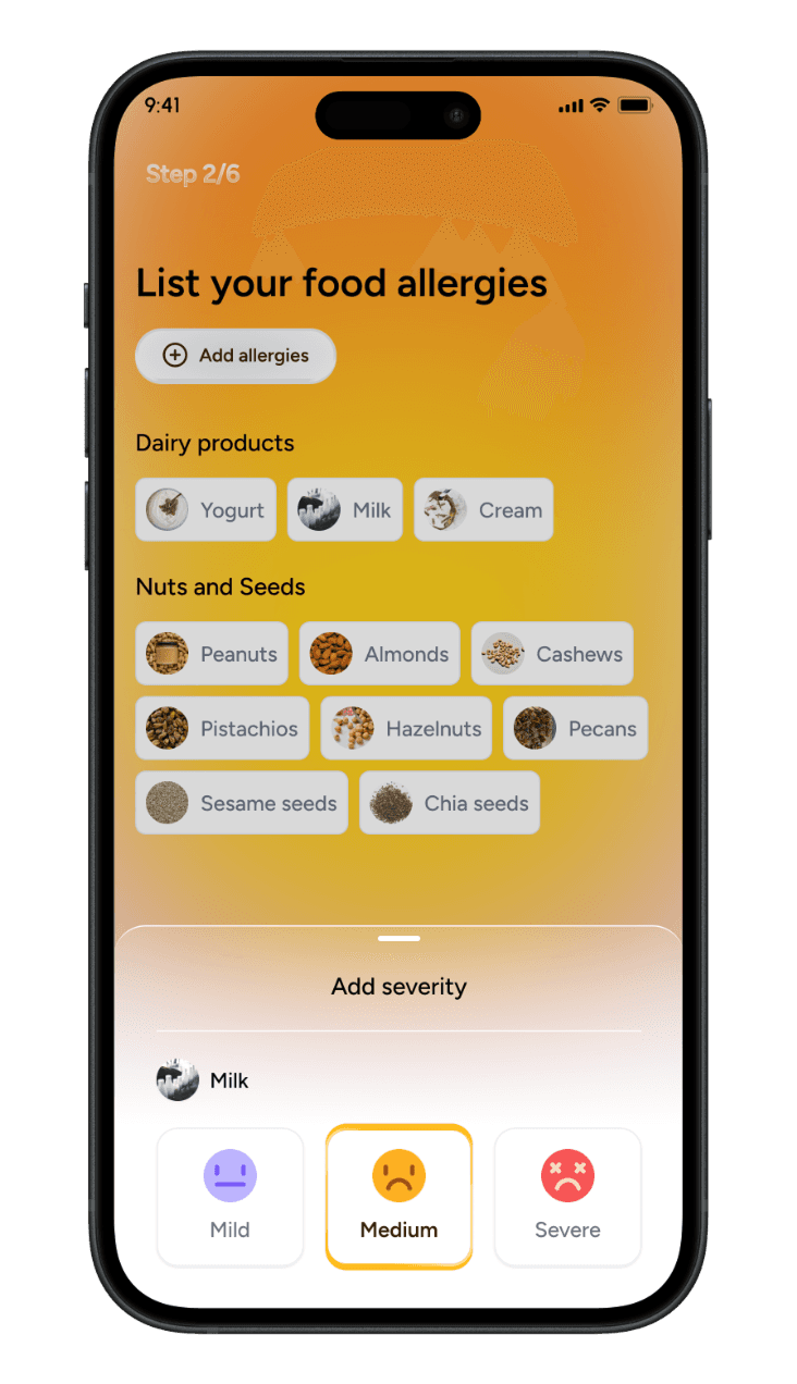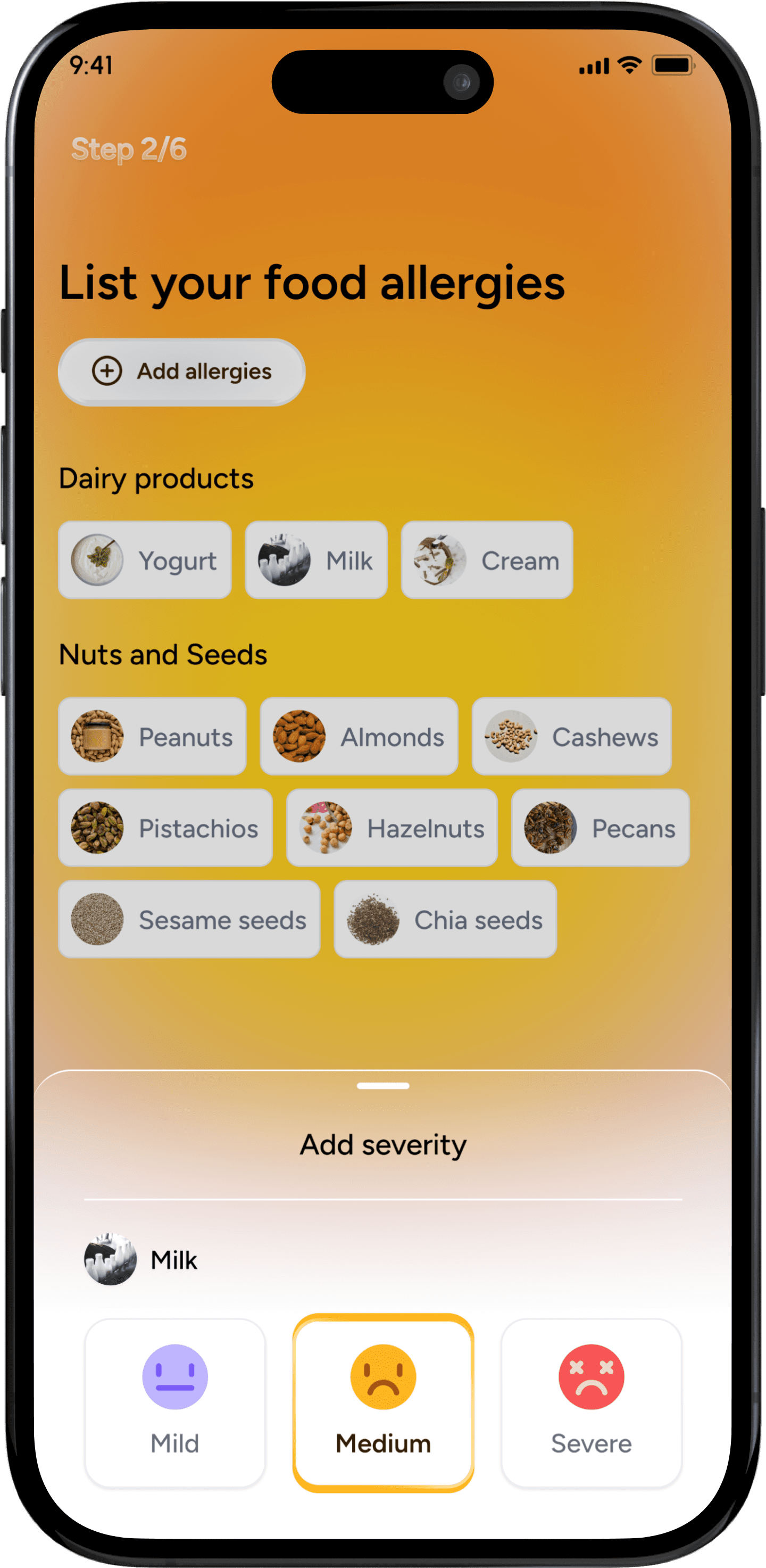 Configure your unique health profile with precision. Define severity levels, from mild intolerances to severe. Receive alerts tailored to your medical needs.